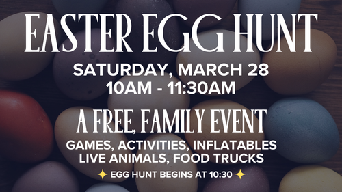 Join us for a free, family event with an egg hunt, inflatables, activities for the kids, live animals and food trucks! This event is open to our church family and our local community. Activities will be geared toward toddler - 5th grade kids. *Egg hunt begins at 10:30AM