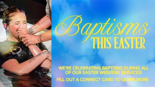 We're excited to celebrate baptisms this Easter! Baptism is an external expression of the reality that you have chosen to follow Jesus. Through the act of being immersed in water and being brought back up, you are identifying with the death, burial and resurrection of Jesus.